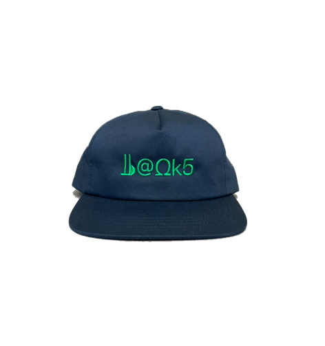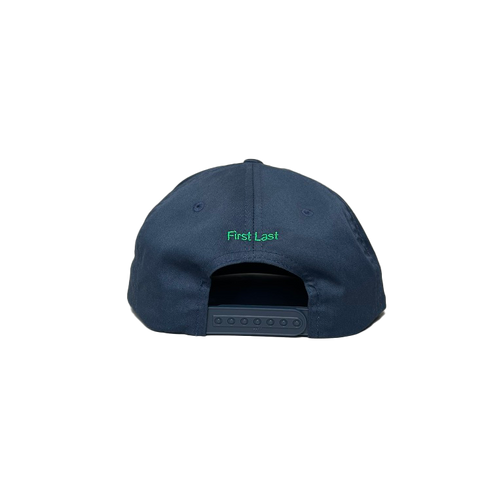 Adjustable snapback. Navy hat with green embroidery on front and back.