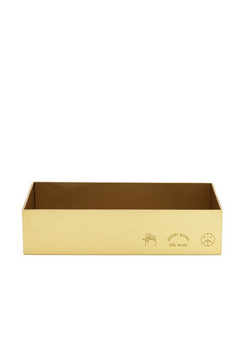 Polished brass tray with inscribed Mister Green logo.